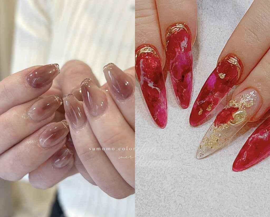 爪を重要視する男性はほとんどいないと思いますが、派手すぎると嫌がる人はいるので、やはり左のシンプルなのが王道だと思います。